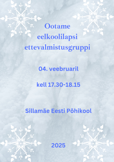 Ootame eelkoolilapsi ettevalmistusgruppi 04.02.2025Kell 17:30 - 18:15Sillamäe Eesti Põhikool Ava foto Avaldatud 08.01.2025. Viimati muudetud 08.01.2025.
