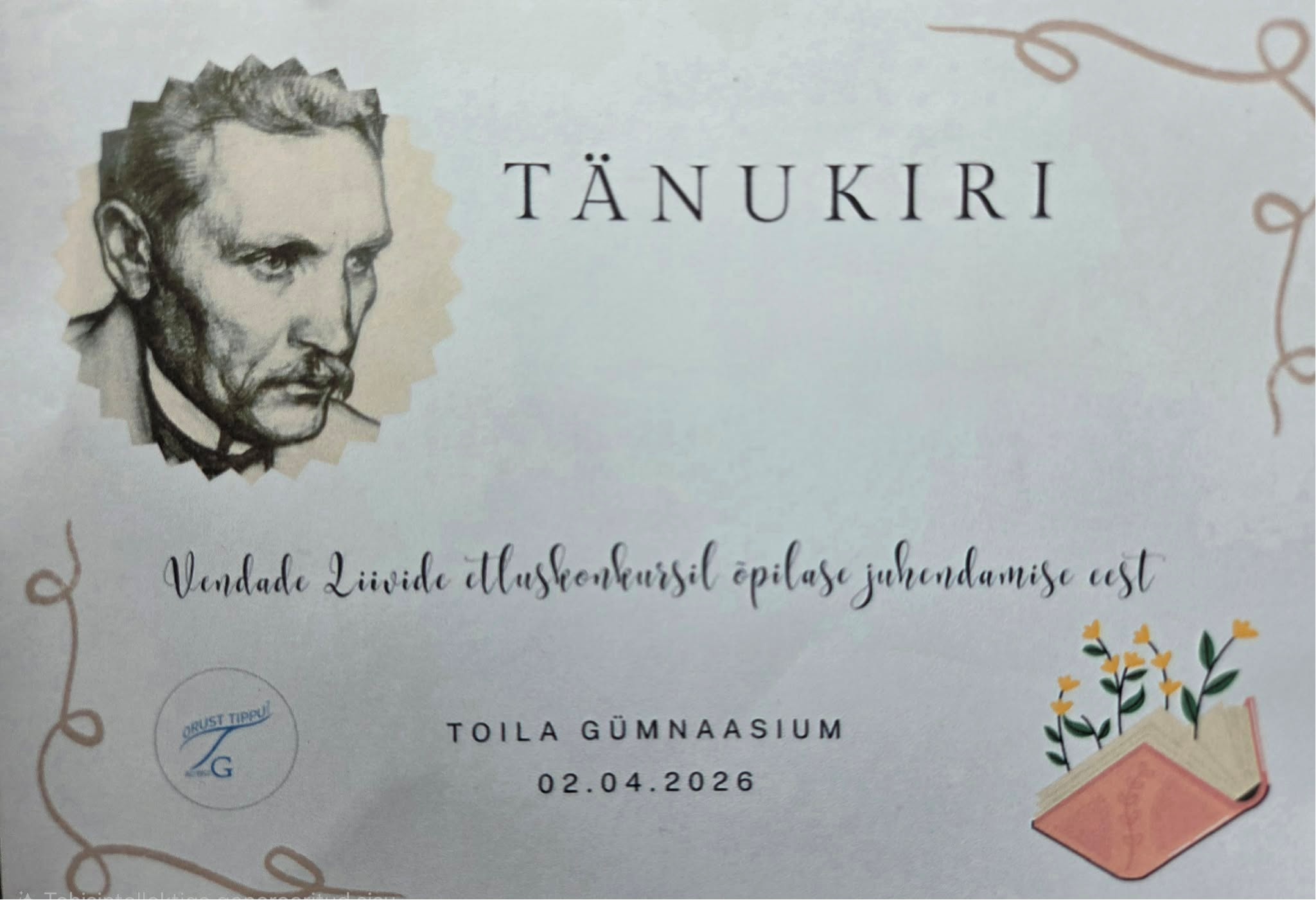 Vitalija Smirnova (8. kl) saavutas etluskonkursil I koha ning on oodatud vabariiklikule võistlusele, mis toimub 10. aprillil Juhan Liivi Muuseumis.